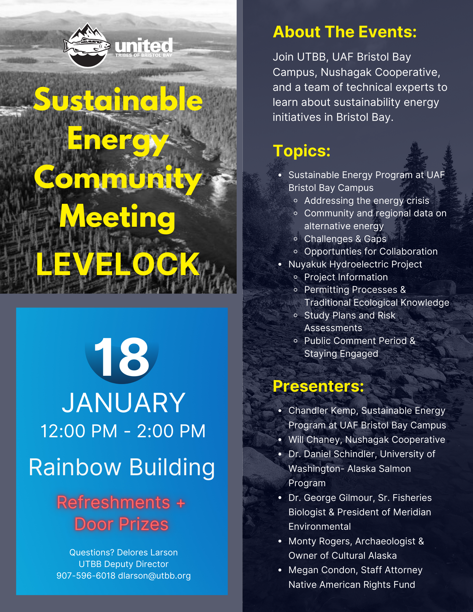 Please join UTBB, UAF Bristol Bay Campus, Nushagak Cooperative, and a team of technical experts to learn about sustainability energy initiatives in Levelock on December 15th! Details in the flier below.