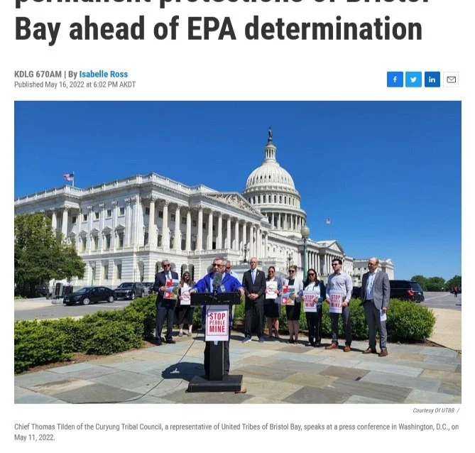 KDLG- Representatives with the United Tribes of Bristol Bay and Commercial Fishermen for Bristol Bay met with members of Congress and the Environmental Protection Agency in Washington, D.C., last week with a request: To permanently block development of the Pebble deposit under the Clean Water Act.